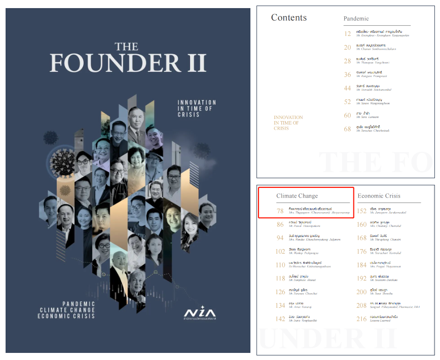 《创始人II》共采访了25位为泰国抗击疫情、应对气候变化和经济危机做出卓越贡献的企业领袖。相对应地,《创始人II》全书共分为三大章节,分别为:大流行病、气候变化和经济危机。其中,气候变化篇刊登了谢纯美女士的观点。