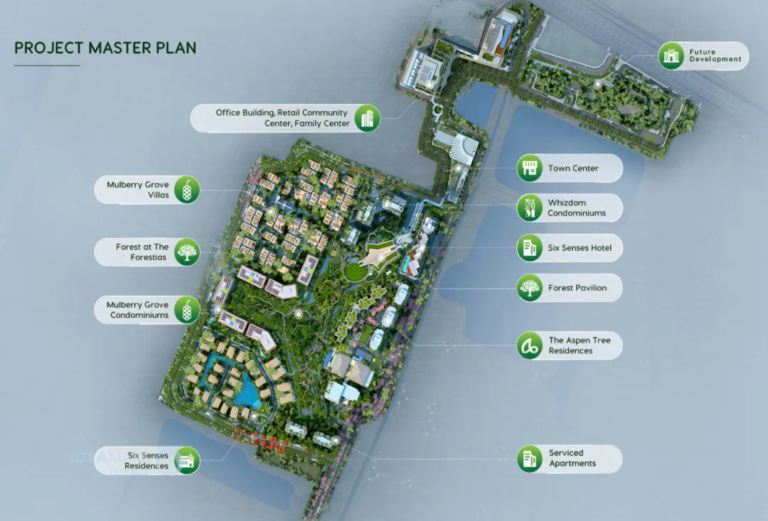 项目拥有包括别墅和公寓在内的多个住宅区,集合了MQDC旗下超豪华代际共居品牌Mulberry Grove、高端养老品牌The Aspen Tree•爱之郡、青年智慧品牌Whizdom•荟知都,并引入全球知名酒店品牌Six Senses•六善,配备医疗、商业、休闲、办公等设施,满足不同生活方式、不同家庭规模的多元需求。