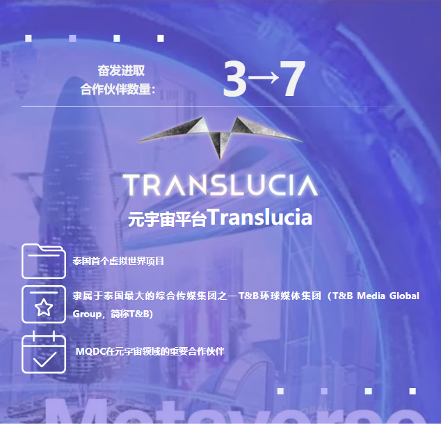 2022年9月15日,元宇宙平台Translucia进一步拓展了其合作网络,与4家相关领域的领先公司达成合作战略,将技术开发合作伙伴数量由3家快速扩容至7家,旨在整合和协调产业资源,打造互联互通、互利共赢、相互兼容的元宇宙生态系统,从而构建出一个价值30亿美元的虚拟世界。